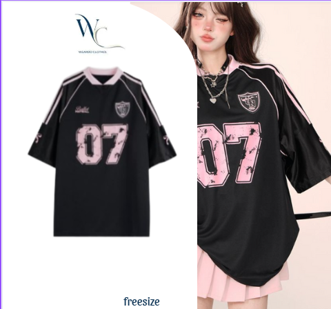 Áo thiết kế ấn tượng: In số 07 phong cách thể thao, phối màu đen – hồng nổi bật.